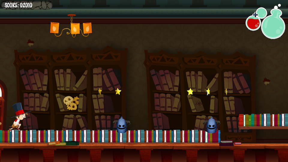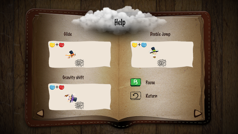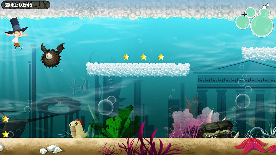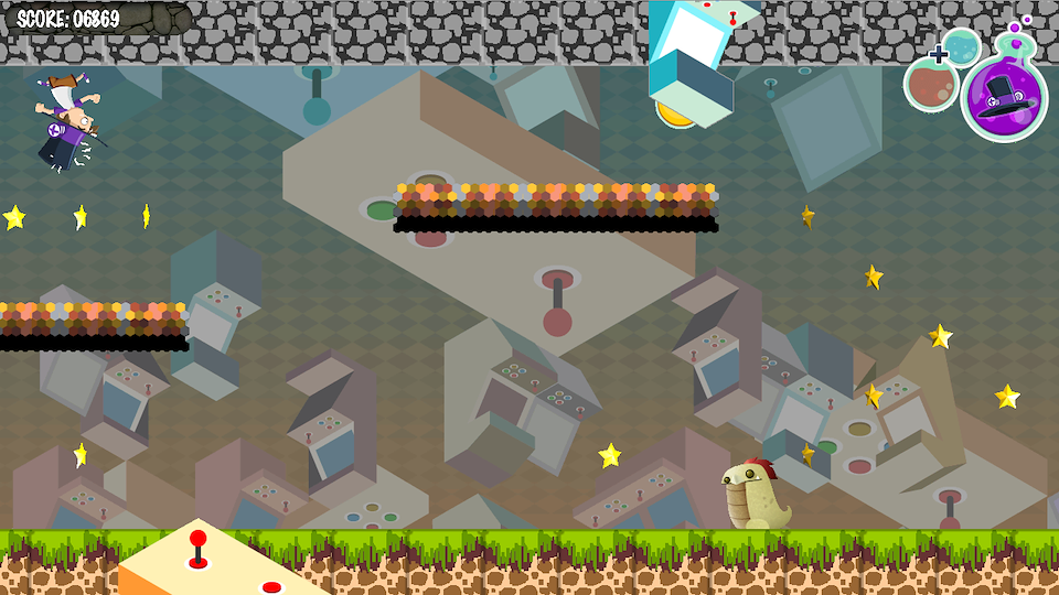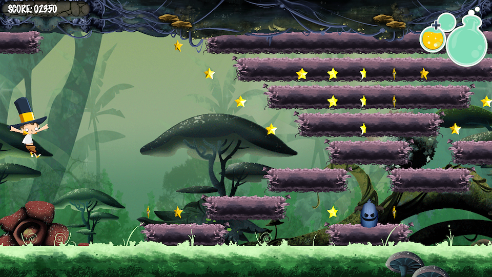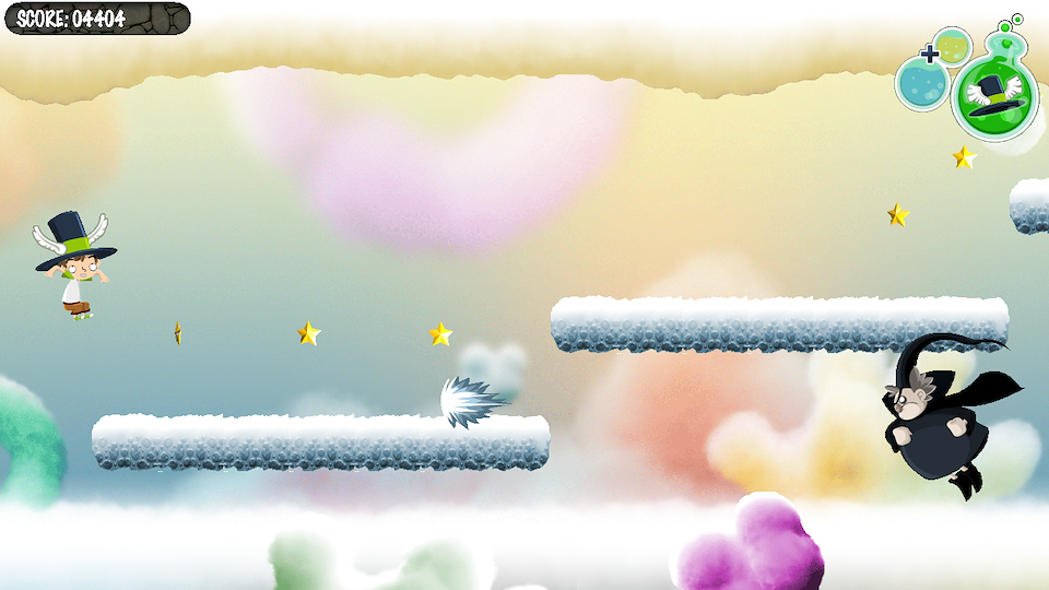 The character must avoid obstacles and enemies in order to succeed; mostly by just jumping. To help him in his task, the player collects colored orbs which, when mixed in pairs, provide special powers.